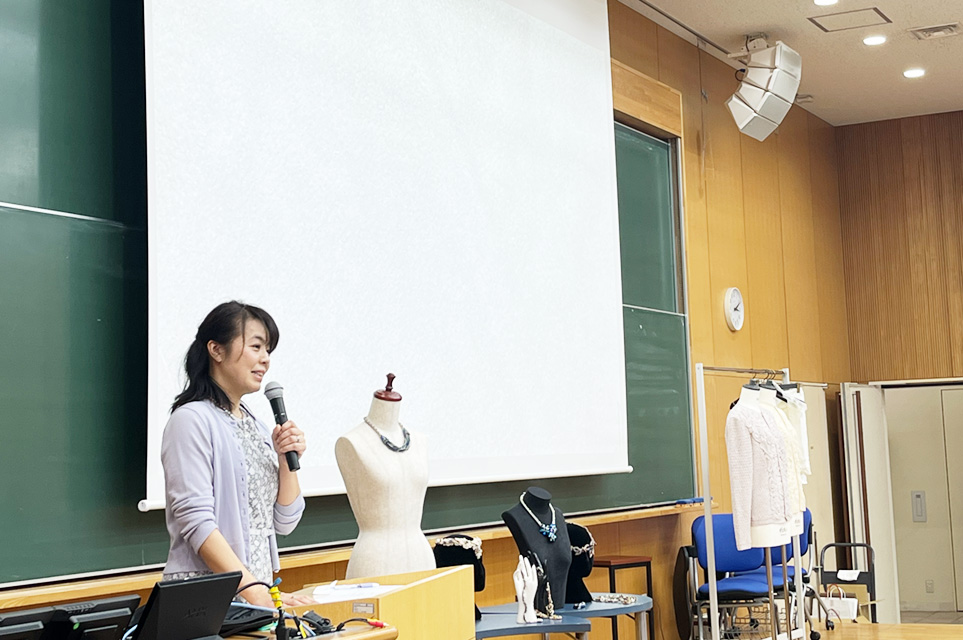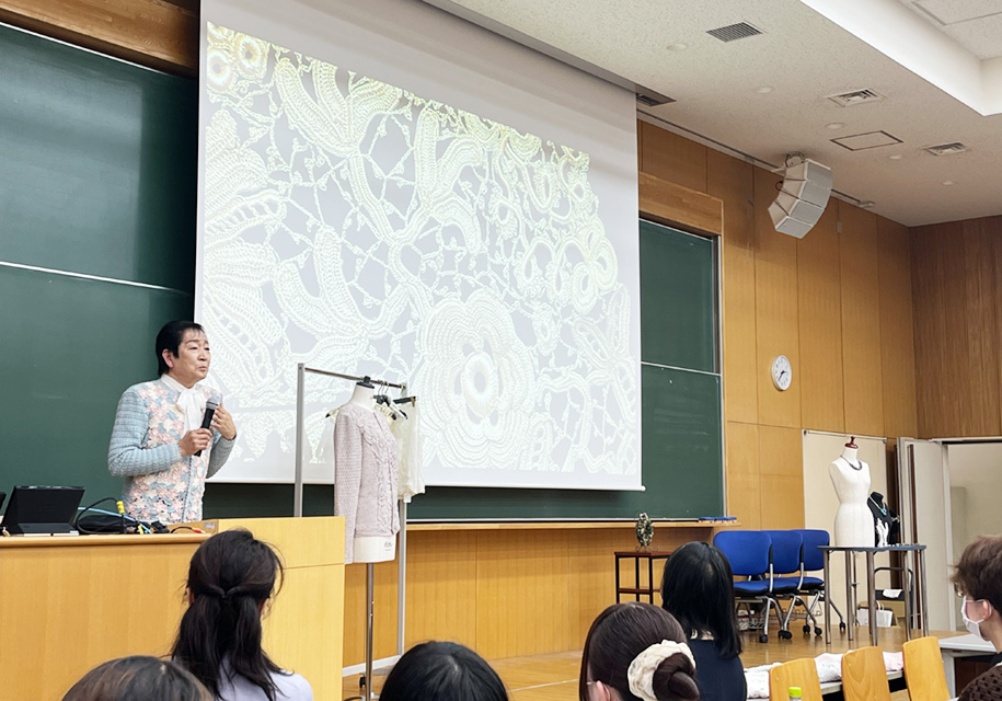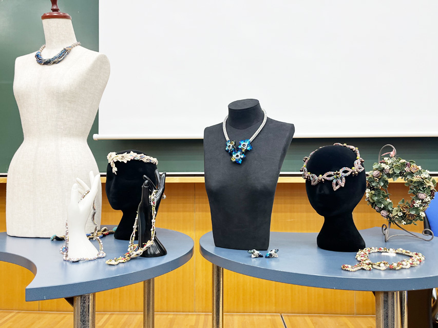 講演は「ニードルワークA(手編み)」「ニードルワークB(欧風刺繡およびアクセサリー制作)」の授業を担当している非常勤講師の髙橋良子氏を含め3人での対談から始まり、広瀬氏、周藤氏それぞれの個人講演へと続きました。広瀬氏は自身の半生、作品のルーツと世界各地のレースの技法や歴史をユーモアを交えながら語り、会場を繊細なレースの世界へと引き込みました。周藤氏は自身がコスチュームジュエリー※作家として現在に至るまでのお話や、創作活動をする際に大事にしていること、アクセサリーをコーディネートする際の知識について楽しく講演いただきました。