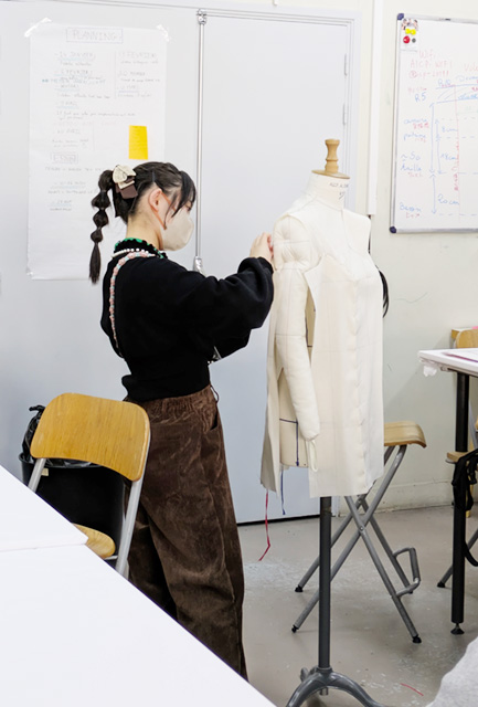 パリ3日目からは、いよいよAICP校での授業です! 事前に、各自で選んだブランドのコレクション作品からコラージュして、ドレスやワンピースのデザインを考えていきます。先生からの講義後にポイントを押さえながら作業を行い、学生たちは5日間に渡り、9:00~17:00まで一日中しっかりとデザインから立体裁断に取り組みました!