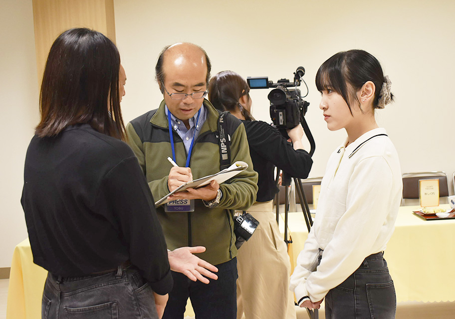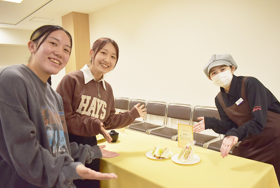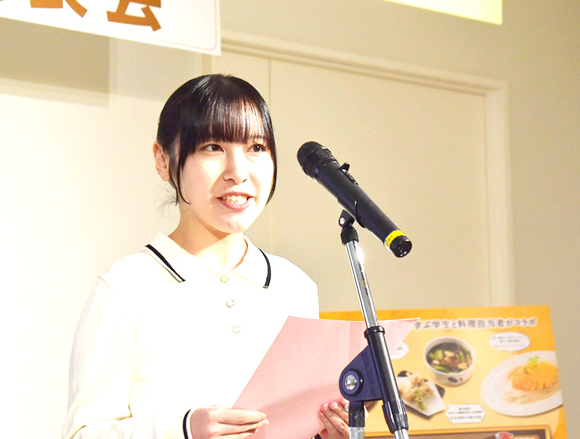10月21日、東武百貨店 船橋店にて、学生たちが考案したメニューの発表会・試食会を行いました。当日は、学生たちがそれぞれの店舗の方と一緒に考案したメニューのおすすめやこだわりポイントを発表。学生たちは、たくさんの取材陣を前に緊張しながらも、しっかりとアピールをしていきました。