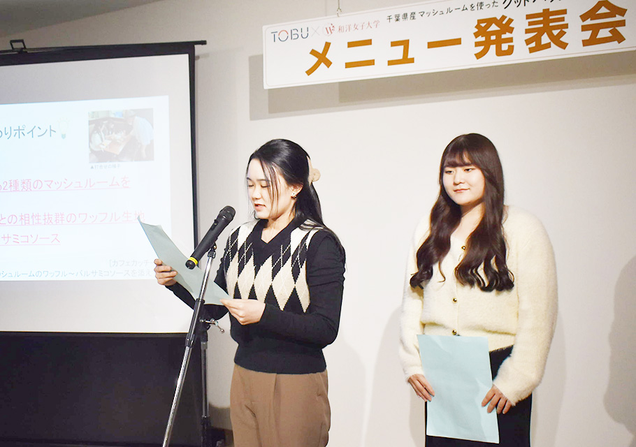 2024年に再始動した、和洋女子大学 健康栄養学科と東武百貨店 船橋店とのコラボレーション企画。今年は「千葉県産マッシュルームを使ったグッドバランスメニューフェア」を実施します。千葉県産の「マッシュルーム」を使ったメニューを、健康栄養学科の学生たち14名が考案し、東武百貨店 船橋店内の食料品・喫茶・レストラン街より7店舗が参加し、今年の秋から期間限定で販売します。指導教員は内野礼子助教です。