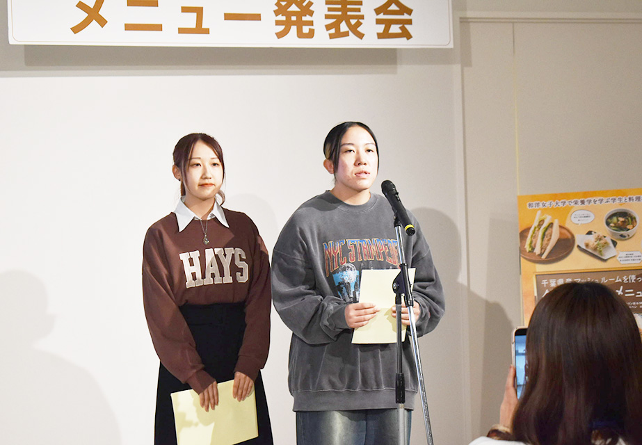 健康栄養学科の学生たちが、お店の方と一緒にこだわりを持って、味だけでなく見た目や栄養のバランスにもこだわって考案。10月21日には、メディア向けにメニュー発表会・試食会も行われ、学生たちがメニュー開発で工夫した点やこだわりなどを発表しました。