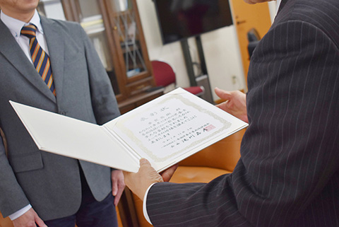 【写真】理事長室での表彰状の授与の様子