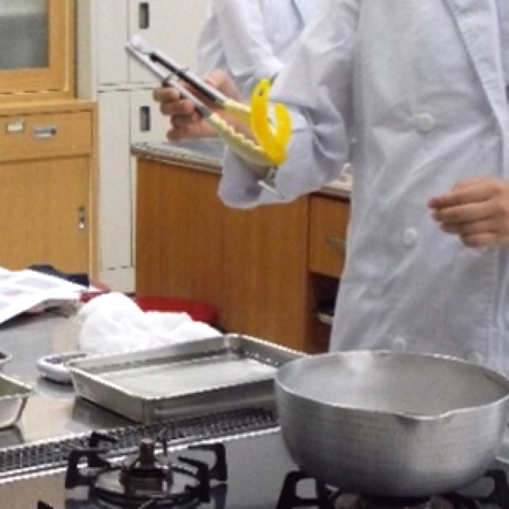 ユニバーサルデザイン※は、住居・建築分野にとどまらず、他の分野においても大切な学びです。今年度は食分野とのコラボレーション(担当:池谷真梨子助教)として、調理室にて「食の視点からみたユニバーサルデザイン」の授業を行いました。