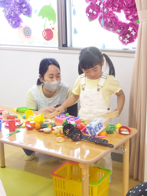 5月18日、青空が広がる和洋女子大学内で「あそぼう・はなそう会」を開催しました。当日は、11家族33名(1歳から7歳の子どもたち15名、保護者18名)が、南館9階のプレイルームに集合してくれました! 新年度を迎えて、初の開催となった「あそぼう・はなそう会」。今回のテーマは、「ゆうえんち♪」。保育士のたまごである在学生たちが、各学年で役割を決め、複数の授業で連携しながら準備を進めました。「こどもの文化演習A」(1年次・選択科目 星野美穂子助教)の1年生たちが室内を飾りつけ、「保育内容 表現」(2年次・選択科目 弓削田綾乃准教授)の2年生たちがあそびのコーナーを準備。そして、「子育て支援」(4年次・選択科目 丸谷充子教授)の4年生たちが、当日の見守りと絵本あそびを担当しました。
