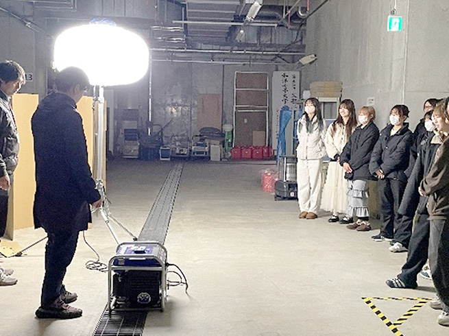 学内の東館の地下へ移動し、大型防災道具の実演をしていただきました。