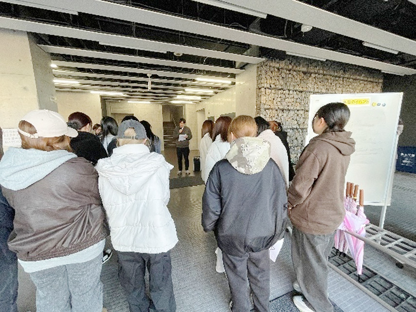 【写真】体育館前で説明を受け、地下の倉庫へ向かいます