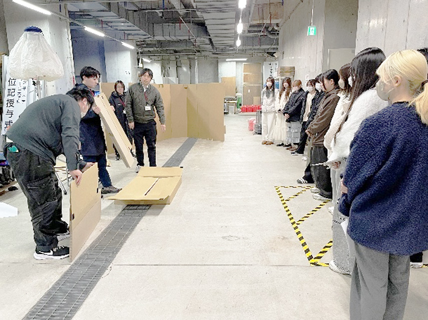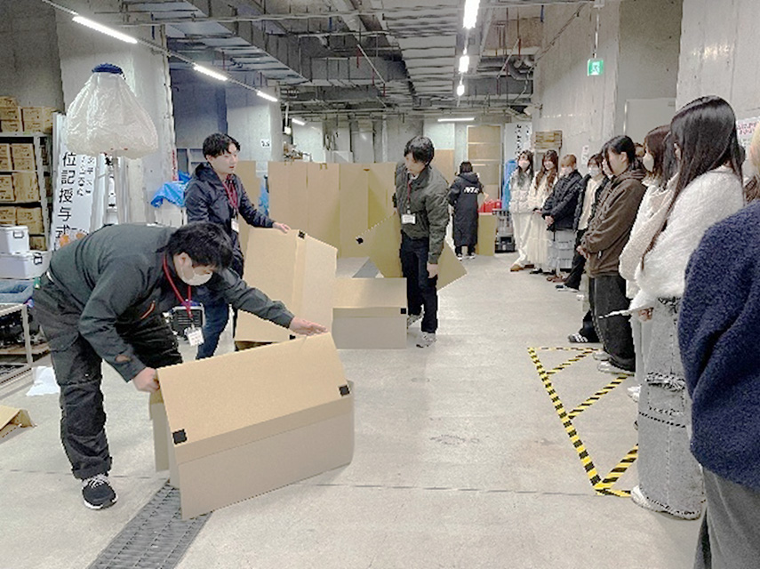 【写真】体育館地下倉庫で説明を受ける学生たち