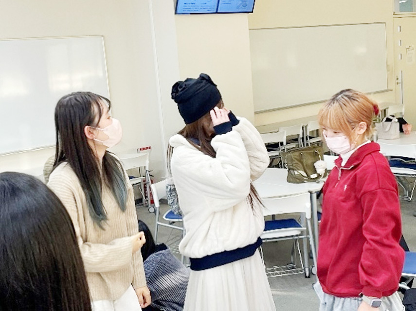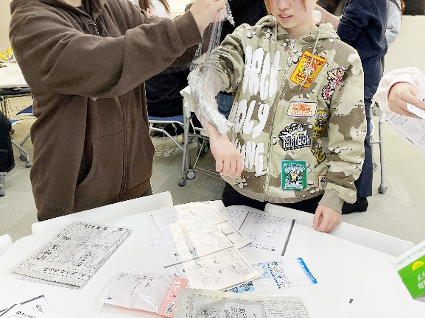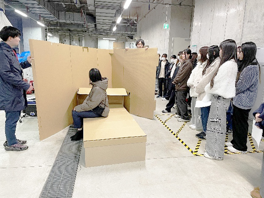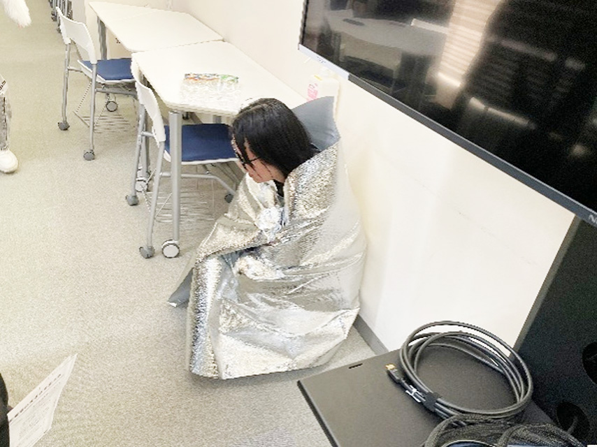 大学には、水や食料、毛布、段ボールベッド、蓄電池など、1,500人が3日間過ごせる量の防災用品が備蓄されているとの説明がありました。実演も交えながら、防災用品がどのように活用されるのかを知り、災害時にも安心して過ごせる体制が整っていることを確認することができました。見学後は教室に戻り、日常生活に身近な防災道具の体験を行いました。新聞紙、アルミホイル、ラップ、紐など、学生それぞれが気になる道具を手に取り、防災時の活用方法を考えながら実際に使ってみました。