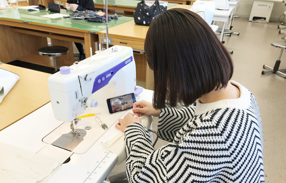 被服制作未経験の学生が増えている現状を踏まえ、実習授業の理解を支援するため、動画を中心としたデジタル教材を作成し、授業内で活用しています。作業工程や注意点を視覚的に示すことで、授業中の説明だけでなく、学生が自分のタイミングで何度でも復習できる環境を整えました。これにより、実習中の大きな間違いが減り、作業の進め方に対する理解も安定するなど、授業全体の質の向上につながっています。被服制作に不安を抱える学生にとっても、安心して実習に取り組める学習支援の一つとなっています。