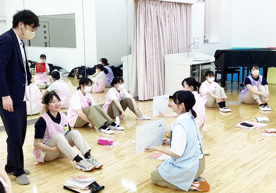 こども発達学科では、幼稚園教諭や保育士になるために、4年間で5回の実習を重ねていきます。2年生は、6月に初めての幼稚園実習を迎えます。今回は、2年生たちが実習の事前指導の授業で、上級生や教員から助言をもらい、準備を進めている様子をご紹介します。
