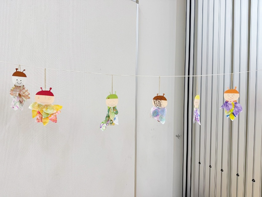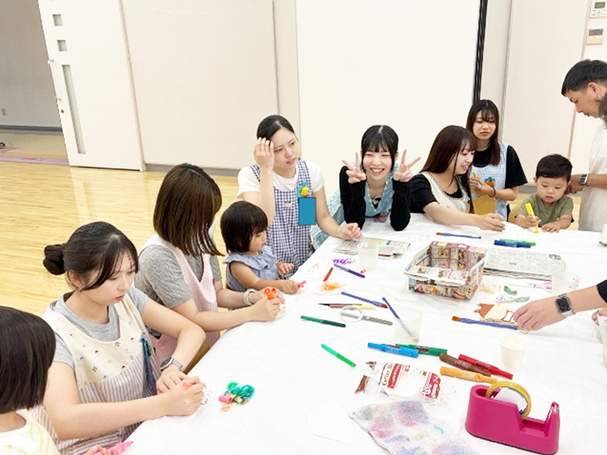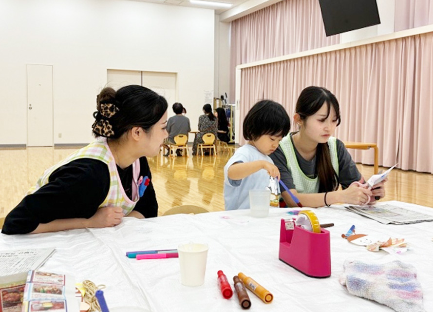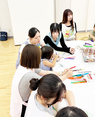 こどもグループでは、学生が主体的に環境を整え、こどもたちが安心して遊べるように支援。製作活動「みのむしづくり」では、いろいろな色の画材を使って自由に表現するこどもたちの姿が見られました。学生たちは、一人ひとりのこどものペースや気持ちに寄り添いながら、声をかけたり手伝ったりしました。これらの経験を通して、学生たちは発達の理解やコミュニケーションの大切さを学び、チームで協力しながらこどもに関わる力を育みました。