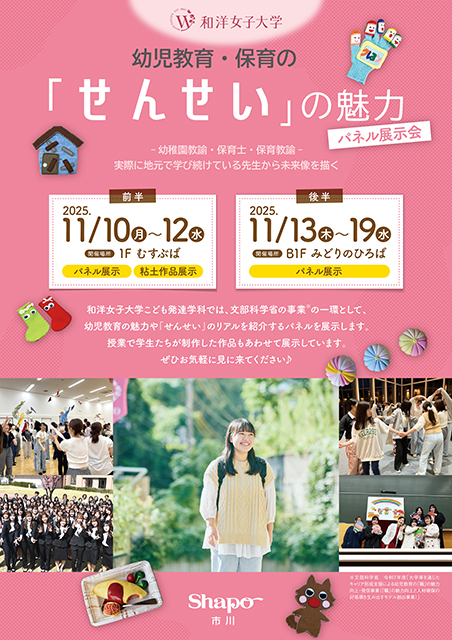 11月10日(月)より、和洋女子大学 こども発達学科では、文部科学省の事業※の一環として、幼児教育の魅力や「せんせい」のリアルを紹介するパネル展示をシャポー市川にて行います。授業で学生たちが制作した作品もあわせて展示しています(11月10日(月)~12日(水))。