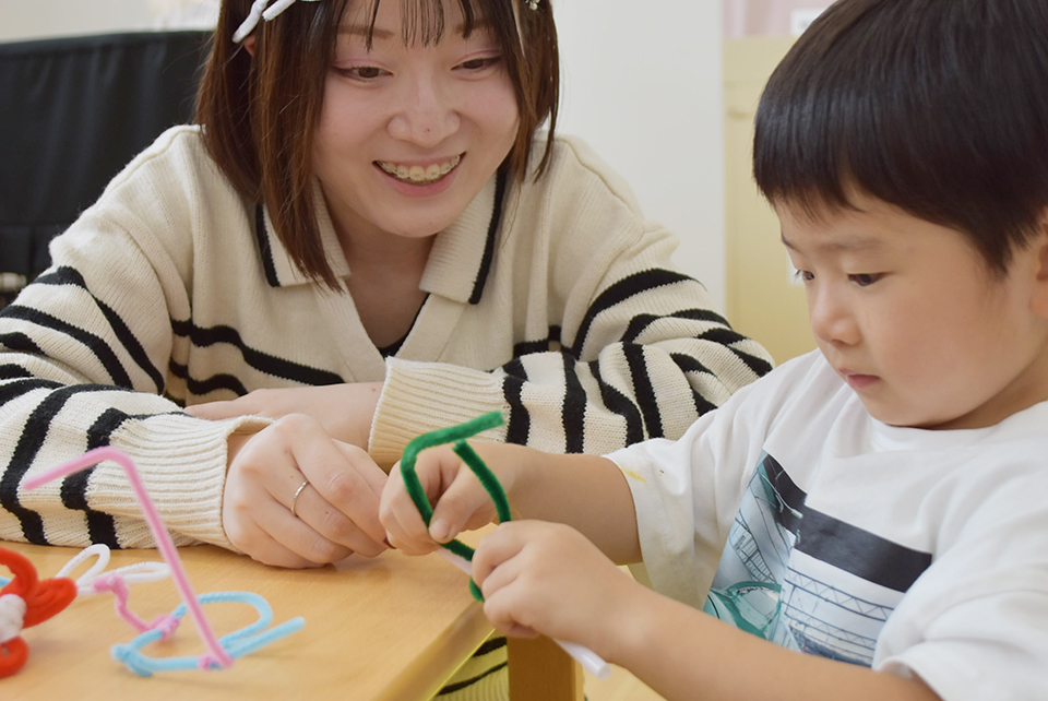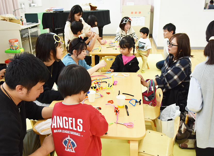 11月1日、2日に開催された里見祭(大学祭)で、こども発達学科の学生たちが北館プレイルームにて、「遊びの広場と親子制作」のワークショップを行いました。学生たちは、未就学児も保護者と一緒に制作が楽しめるような企画を考え、準備して里見祭に臨みました。