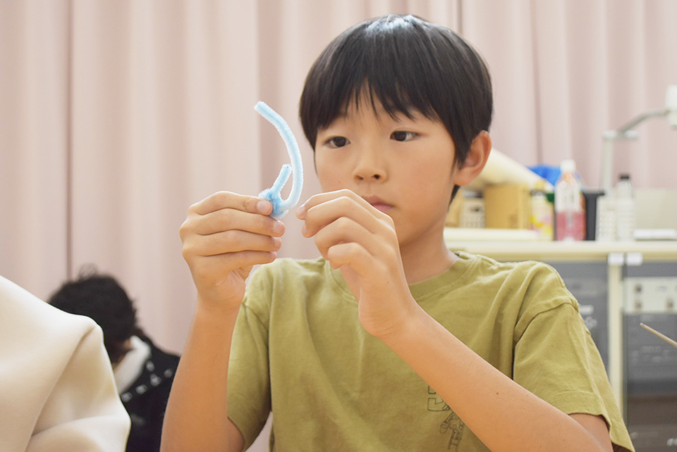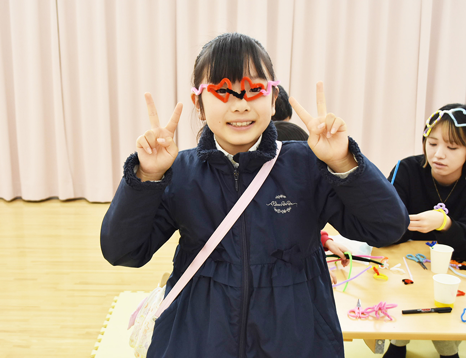 学生たちが考えたワークショップは、「モールを使った指輪や髪飾り、メガネ作り」と「紙コップと風船でクラッカー作り」など、簡単なだけでなく、皆が夢中になって制作できるものばかりで、大人も子供も出来上がった作品をすぐに使って、楽しむ姿がたくさん見られました。