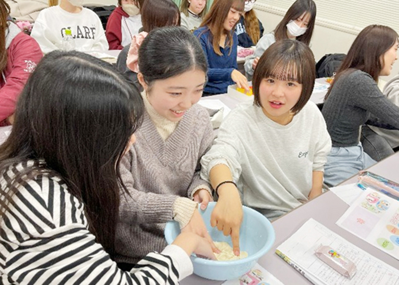 特別講義の授業前には有志の4年生も加わり、小麦粉粘土と片栗粉の準備を一緒に行いました。岡田先生は、体験型授業のために、色付き寒天を事前に準備して持ってきてくださいました。小麦粉粘土づくりのポイントは、水の量と油と塩加減、そしてしっかりこねること! 穂苅先生と岡田先生に丁寧にレクチャーしていただき、準備は順調に進みました。