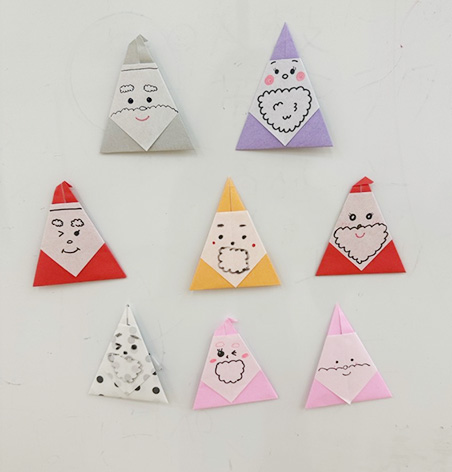 今回は、季節の制作として皆で一緒にサンタクロースづくり! 子どもたちは好きな色の折り紙を選び、学生と一緒に顔を描きながら、自分だけのサンタクロースを完成させました。それぞれ表情の違う個性豊かな作品が並び、「かわいい!」「お家に飾る!」と嬉しそうな声が聞かれました。