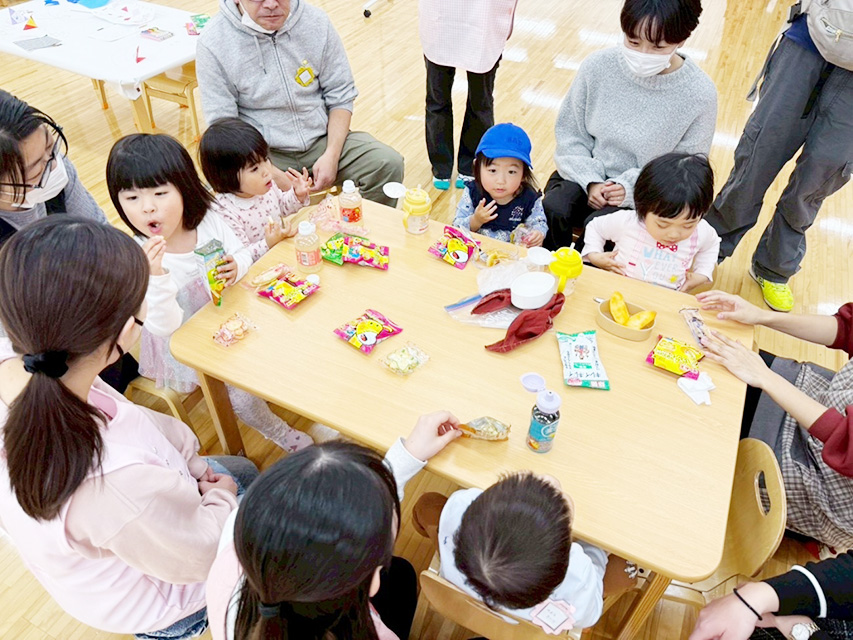 【写真】和やかにおやつを楽しむこどもたちと保護者の皆さん、学生たち