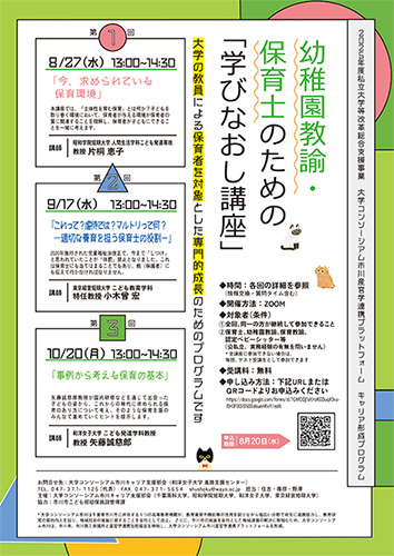 実際に幼児教育・保育の現場で課題となっているテーマについて、その分野を専門とする大学コンソーシアム市川を構成している短期大学・大学の教員が、保育者の専門性の向上やキャリア形成をめざし、現役の保育者へ、学びなおしの、また学びを深める機会を提供するために、全3回にわたってオンラインで開催しています。