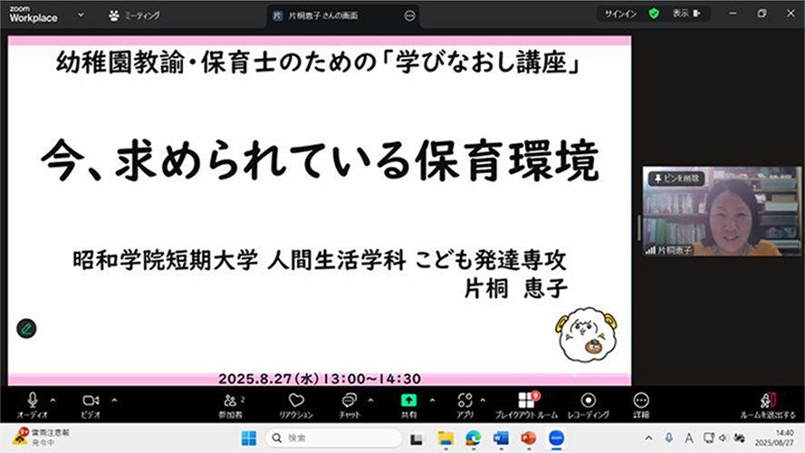 第1回「今、求められている保育環境」の講師は昭和学院短期大学の片桐恵子教授。千葉県内など各地から現役の保育者等54名(9/10現在、アンケート回答数)が参加し、現場の先生方の学びへの意欲の高さを改めて感じられるものとなりました。終了後、受講者からは「事例をもとに、様々な保育や主体的な保育を学ぶことができた」「子どもの考えていることや発想をありのままに実現し、一緒に喜ぶ事の出来る仕事である事を改めて学ぶことが出来ました」といった感想がありました。