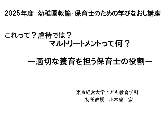 第2回「これって? 虐待では? マルトリって何? ―適切な養育を担う保育士の役割―」の講師は東京経営短期大学の小木曽宏特任教授。千葉県内など各地から現役の保育者等80名が参加されました。終了後、受講者からは「マルトリートメントという言葉を初めて知りました。施設や地域一丸となってみんなで子どもたちを見守っていくことの重要性について考えさせられました。ありがとうございました」「日々の保育について考えさせられました」「虐待について、改めて学び、日々の子どもの様子から保育者も助けることができることを学べました」といった感想がありました。