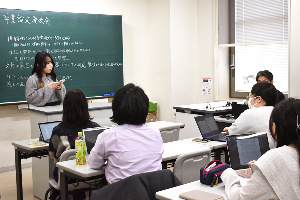 こども発達学科では、保育者としての全学生共通の学びに加えて、卒業研究を通じて自分ならではの学びを深めることにも力を注いでいます。