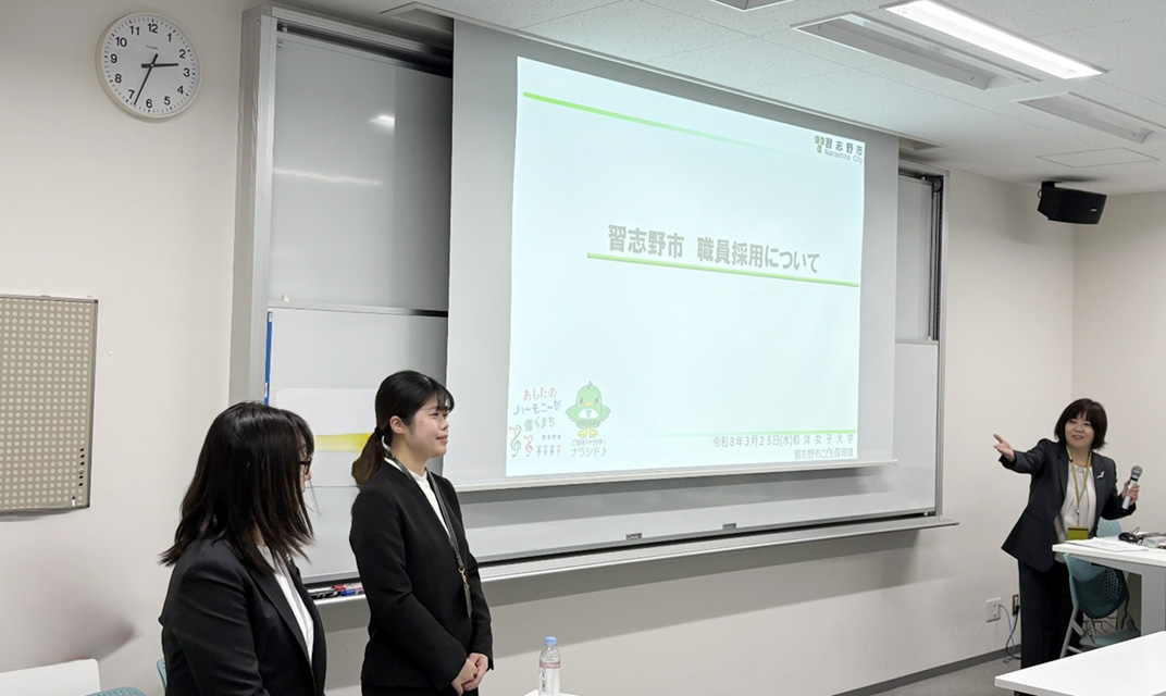 3月下旬、幼稚園教諭・保育士をめざす学生のための『千葉市、習志野市、船橋市 合同就職説明会』を実施しました。はじめに、実際の採用担当者や保育士の方々に登壇いただき、それぞれの自治体の説明を30分間行っていただきました。その後、各市にわかれて自由に質問をする時間を設けました。各市から3名ずつお越しいただき、和洋女子大学のOG(卒業生)も一緒に参加。採用について説明はもちろん、勤務の状況や大変なこと・嬉しかったこと等、勤務実態についてもわかりやすくお話いただきました。学生一人ひとりが自身の将来像を具体的に描くことができた良い機会となりました。