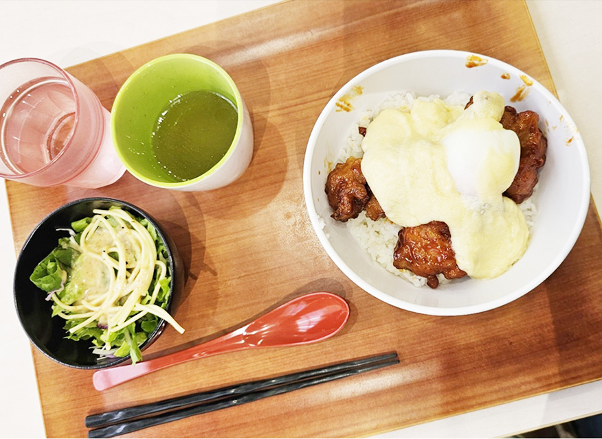 【写真】一番好きな和洋の学食のランチ。唐揚げの上にチーズと卵がトッピングされていておいしい!