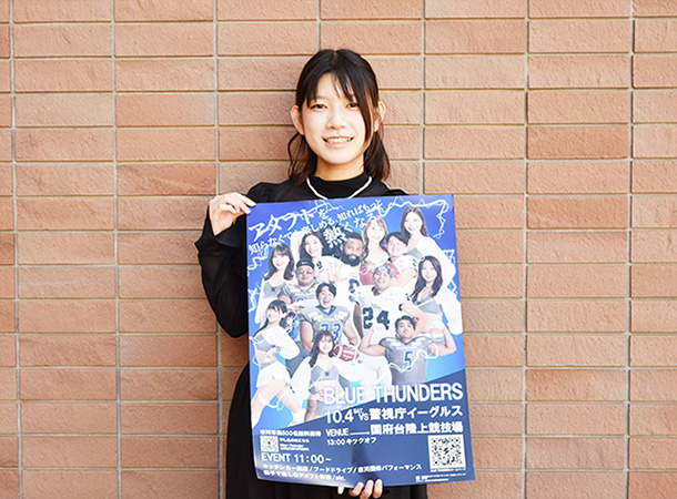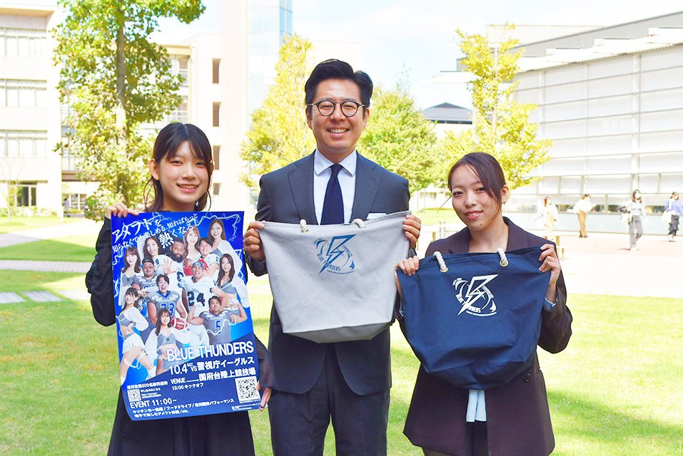 日本文学文化学科 文化芸術専攻の学生が、千葉県市川市に本拠地を置くアメリカンフットボールチーム「ブルーサンダース」のポスターデザインと、オフィシャルグッズのトートバックのデザインを担当しました。2023年~2024年の2年間にわたって、地域連携の一環として和洋女子大学の学生がブルーサンダースのサポーターTシャツの制作に取り組み、好評だったことを受けて、今回は新たにオフィシャルグッズの制作を行うことになりました。