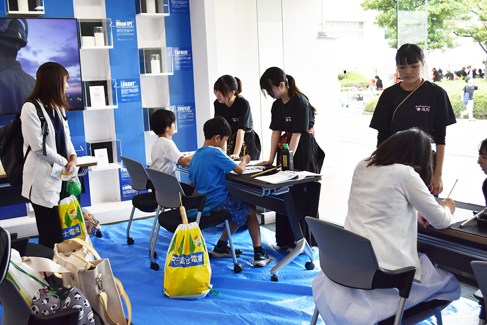 学生たちはパフォーマンス後、会場内で11時から書道教室も開催。多くの方々への丁寧な指導やサポートが喜ばれました。
