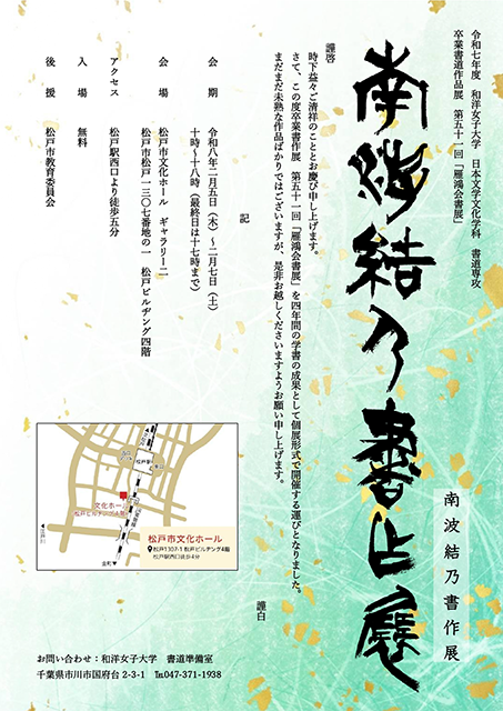 日本文学文化学科 書道専攻4年生による卒業書道作品展、「第51回 雁鴻会書展」の個別展覧会を開催中です。4年間の学びの集大成として、卒業論文の題目をテーマとして制作した作品展示を中心に、学生一人ひとりが企画、立案、ポスター制作、運営までを行います。学生自身の出身や所縁のある市町村の会場にて個別展覧会を行う、全国でも珍しい卒業書道作品展です。入場無料、数日間の限定開催。ぜひ、お越しください。