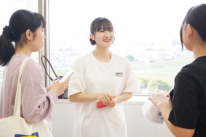 梶原さんの就職活動においても、和洋女子大学の進路支援センターの細やかなサポートが大きな力となりました。梶原さんの場合も、進路支援センターが開催した企業説明会で、現在の勤務先であるシェラトン・グランデ・トーキョーベイ・ホテルの人事担当の方とお話ししたことが、始まりだったそうです。その後、本格的に企業研究をし、その過程では、先方の人事の方にも顔と名前を覚えていただくほど、機会があれば熱心に出掛けていったそうです。進路支援センターでは、学科ごとに担当カウンセラーが配置され、細やかな個別の指導を行っています。梶原さんの場合も、担当カウンセラーにより、書類添削やグループワークの練習、面接の練習などを特訓してもらい、見事内定を手に入れたようです。今回、進路支援センターから職員3名も駆けつけ、シェラトンでの仕事について語る梶原さんの姿を見守ってくださいました。