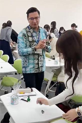 後半は辻るりこ准教授の「実践英語II-b」にて、伝統的なゲーム「Batu Seremban(バトゥ・セレンバン)」を体験しました。投げたお手玉が空中にある間に残りを拾うというシンプルながら集中力が求められるゲームに、学生たちは歓声を上げながら挑戦し、会場は大いに盛り上がりました。