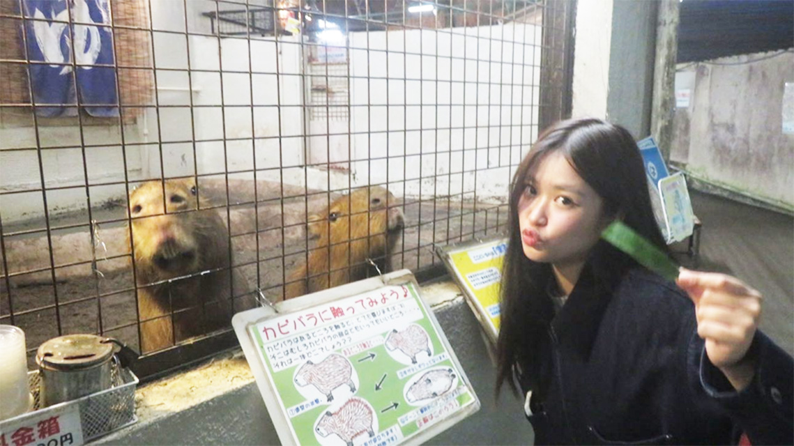 【写真】カピバラさんたちとの3ショット。最初は見向きをしてくれなかったのに餌をあげたら一緒に映ってくれました。可愛いです!」
