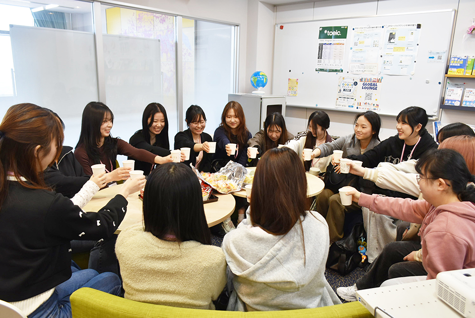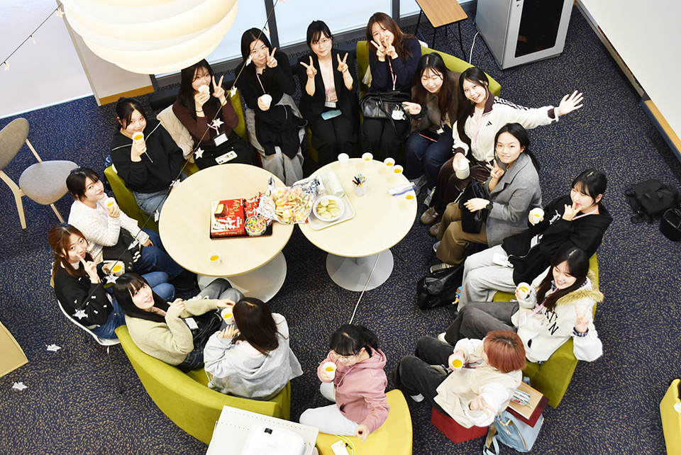 テーブルには韓国や日本のお菓子や飲み物が並び、お気に入りのK-POPを聞きながらお互いの国の観光地や日常生活の違いについても話が弾みました。リラックスした雰囲気の中で、日本語や韓国語を織り交ぜながらコミュニケーションを取る姿が印象的でした。