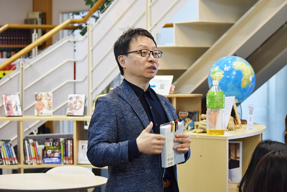 【写真】韓国語と日本語を使い、わかりやすく語りかける金範洙准教授