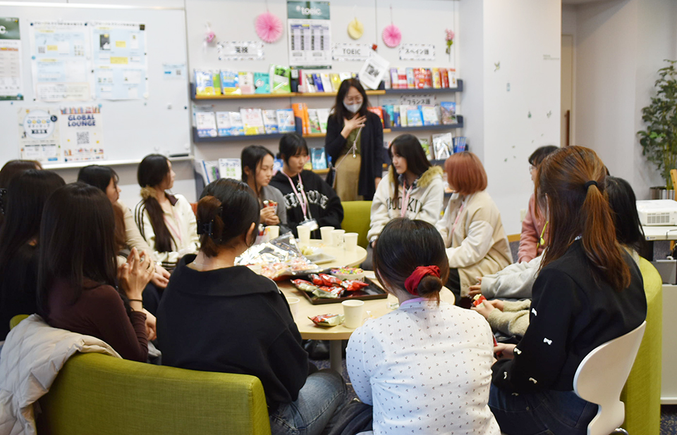 4月8日、和洋女子大学のグローバル・ラウンジにて、韓国からの交換留学生とWAYO留学生バディーズ※による交流会が開催されました。まず、センター長の内田翔大准教授、副センター長の金範洙准教授、そしてセンター職員による挨拶が行われ、留学生を歓迎するメッセージとともに、交流を通じて視野を広げてほしいという期待が伝えられました。