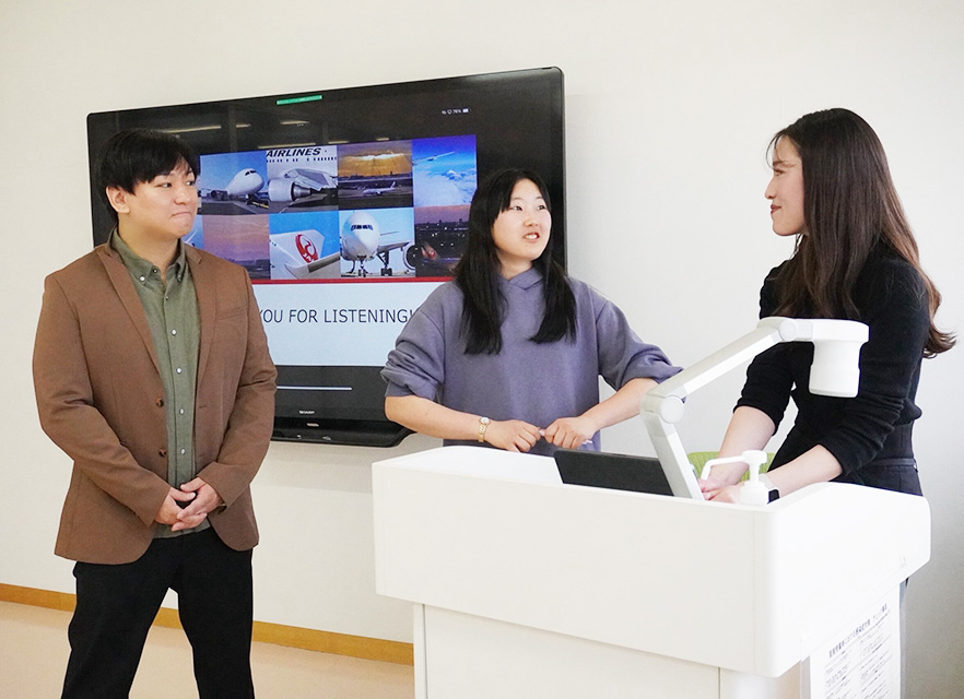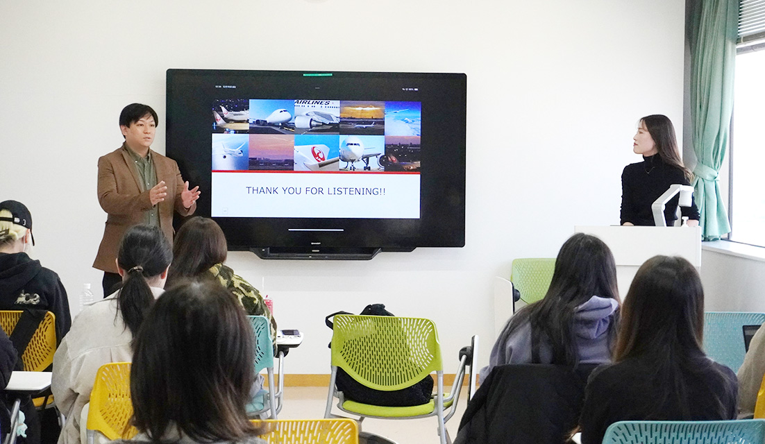 2025年12月19日、英語コミュニケーション学科 航空・ホテル業界プログラム第7段として、2021年3月に人文学部 国際学科 英語文化コミュニケーション専攻(現 英語コミュニケーション学科)を卒業した鈴木咲紀さんに、ミニ講義をしていただきました。鈴木さんは、羽田空港においてJAL(日本航空)のグランドスタッフとして、株式会社JALスカイに2023年3月から勤務しています。当日は、英語コミュニケーション学科のほか国際学科からも学生が集い、鈴木さんの実体験に基づくお話に熱心に耳を傾けていました。司会は、英語コミュニケーション学科の内田翔大准教授が務めました。