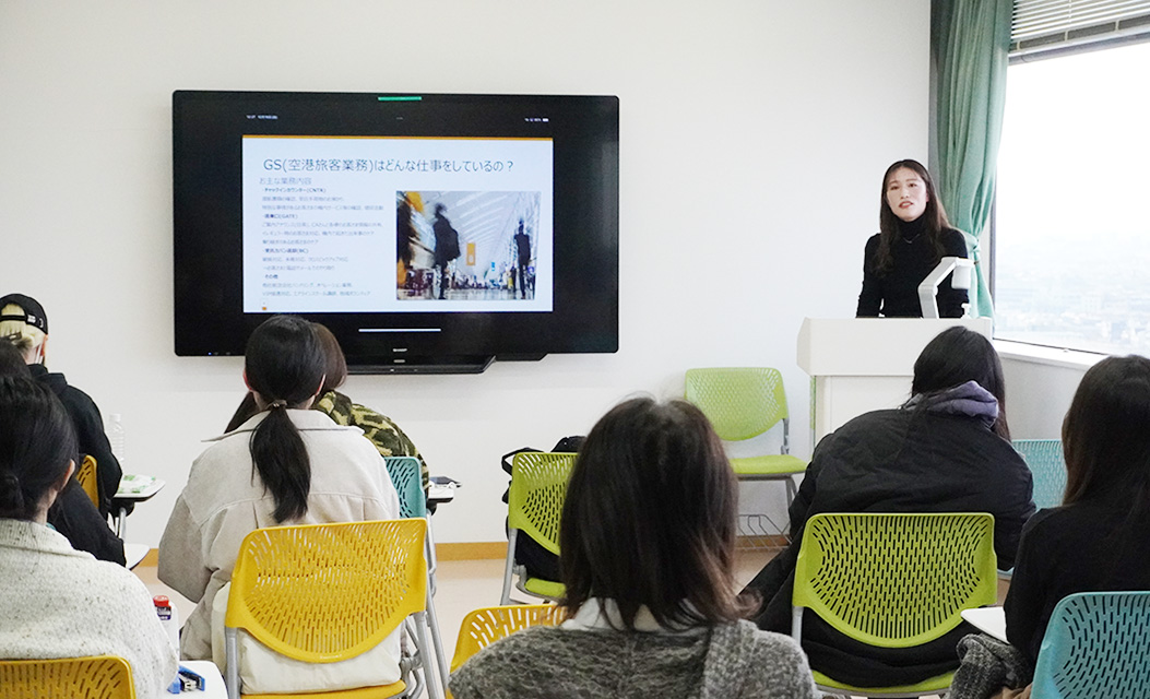 羽田空港で「JALらしいおもてなし」を届けるグランドスタッフとして働く卒業生が来校! 航空・ホテル業界プログラム第7弾、開催!