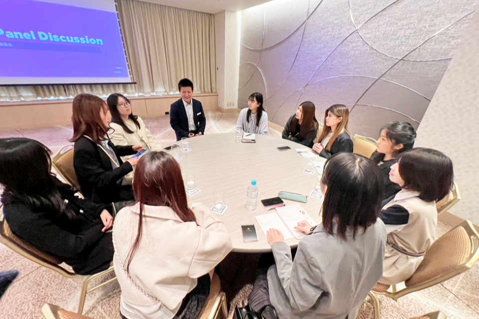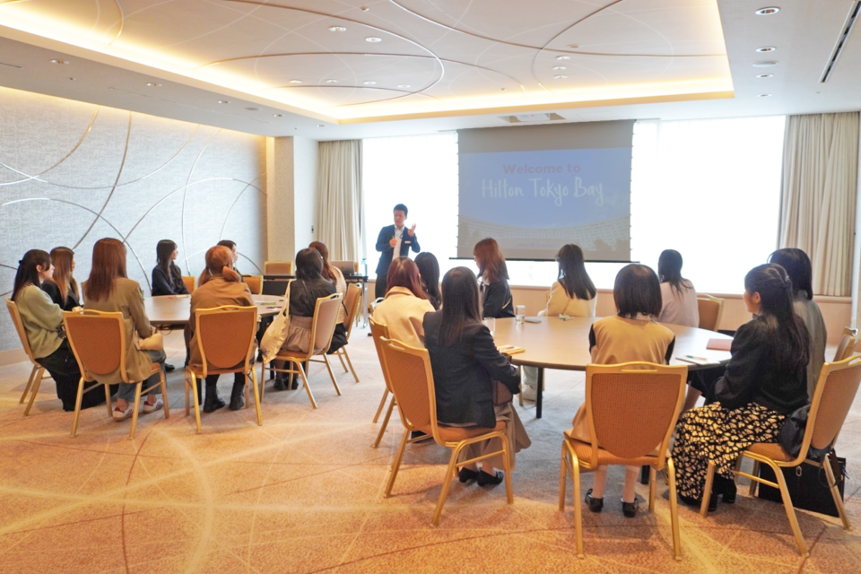 その後、学生たちは宴会場に移動し、ホテル業界の解説や、ヒルトンの理念・働き方について担当者から説明を受けました。ホスピタリティ業界の最前線を走る企業の姿勢や、具体的な取り組みに触れることで、自身のキャリアについて考える良いきっかけになりました。