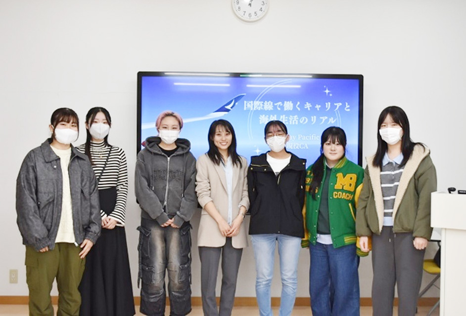 今回、「エアラインプログラム」の一環として、国際学科の卒業生で、現在はキャセイパシフィック航空の客室乗務員(CA)として活躍する鎌田結衣さんを講師にお迎えし、講演会「国際線で働くキャリアと海外生活のリアル」を実施しました。講演会には国際学科の学生だけでなく、英語コミュニケーション学科の学生も参加し、盛況を博しました。