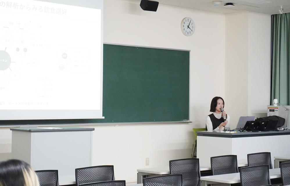 分析の結果、日本食(寿司、焼肉、ラーメンなど)やカフェへの関心の高さが確認されるとともに、価格帯による選択傾向の違いも示されました。また、KHコーダというソフトを利用したクチコミの解析から、飲食店選択が複数の要素によって構成されている可能性が示唆されました。このような、データ解析に基づき観光行動を読み解く研究手法について紹介を受け、参加した学生にとっては、観光研究の方法論を具体的に学ぶ貴重な機会となりました。