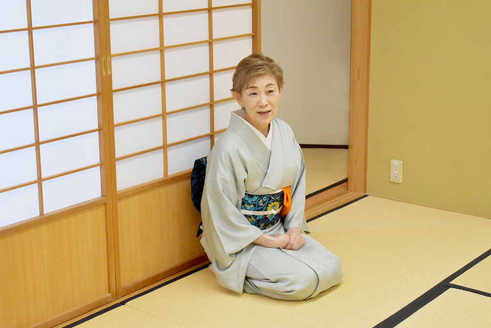 看護学科の「礼法」の授業では、専門的な看護技術だけでなく、美しい身のこなしを身につけるため、表千家茶道を取り入れています。先日の礼法の授業では、自分で点てたお茶を自分でいただく「自服」※で、礼儀作法や言葉遣いなど、茶道における美しい所作を、田中はる美客員教授と及川有紀子客員講師から学び、今回のお茶会で実践しました。