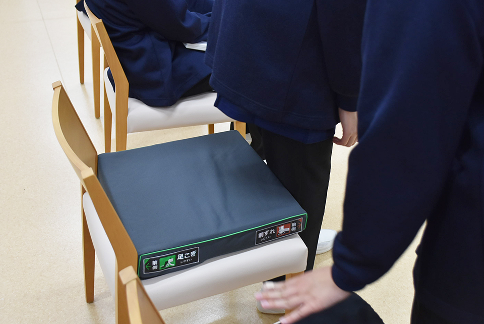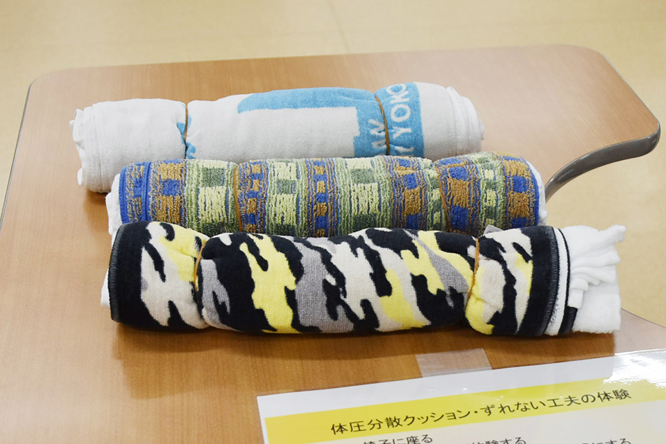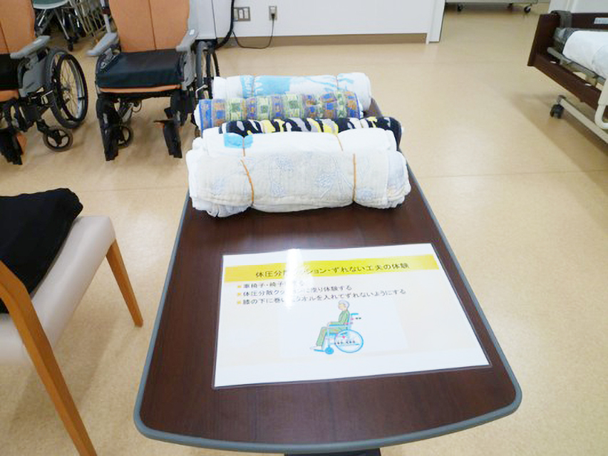 痩せている療養者は、臀部の骨が座面に当たり圧迫されることで血行障害から褥瘡となる場合があります。臀部の血行障害を予防するための体圧分散クッションを体験しました。また座位時のずれによる摩擦も褥瘡の原因となります。膝下にクッションを挟み、体のずれの予防を体験しました。