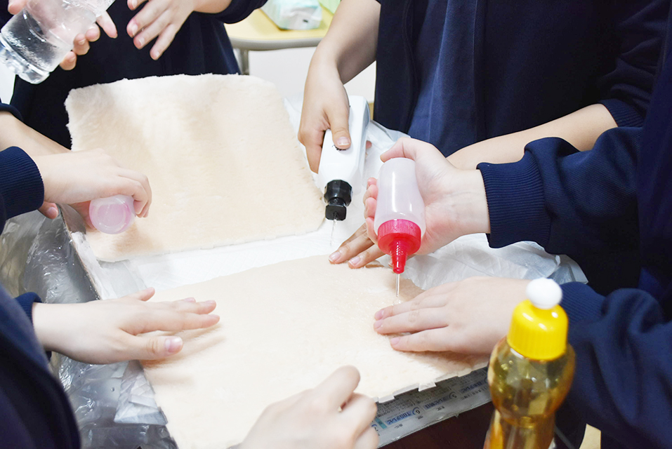 創洗浄体験では、小さいボトルは持ちやすいが、水圧が弱いなどの体験をしています。
