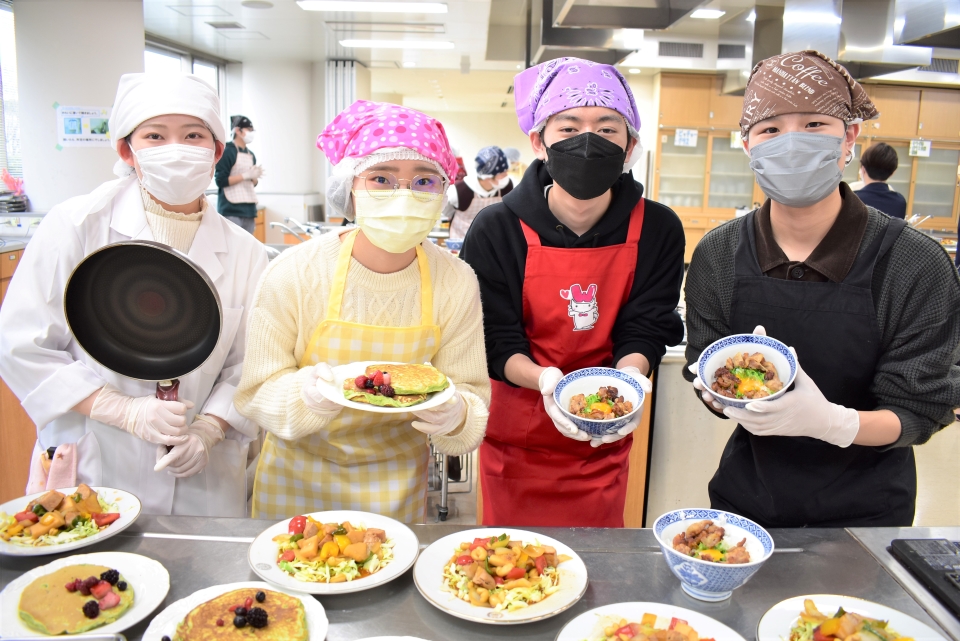 今回、学生たちが調理に挑戦したメニューは、ボランティア部の学生が考案した「マグロとカシューナッツの中華炒め」、「スタミナ豚丼」、「ほうれん草のホットケーキ」の他、今年から登場した新メニューの「豆花」の試食もありました。いずれも、鉄分が豊富に含まれた“貧血を防ぐ”メニューです。