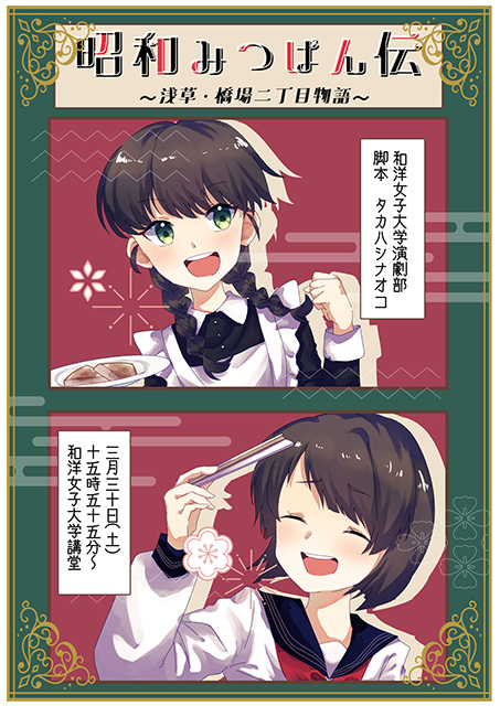 3月30日(土)、和洋女子大学構内にある和洋学園講堂で、和洋女子大学演劇部・千葉商科大学演劇部「合同自主公演」を開催します。和洋女子大学演劇部の演目は、「仲良きことは美しきかな!……仲いい?」(15:05開演)と、「昭和みつぱん伝 浅草・橋場二丁目物語」(15:55開演)です。ぜひ、ご来場ください。