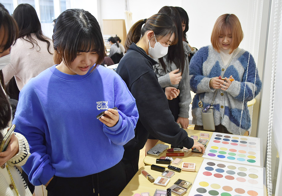 当日は、各学科から総勢30名の学生たちが集まり、自分のパーソナルカラー(4シーズン)やメイクのポイントについて一人ひとり診断を受けました。学生たちは講師の方からのアドバイスを受けながら、手持ちのコスメをパーソナルカラー別に仕分けするなど、楽しみながらレッスンに取り組みました。