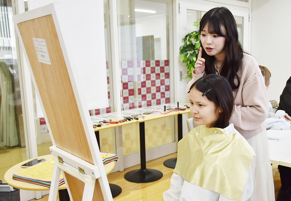 【写真】講師の方々からパーソナルカラー診断を受ける学生たち