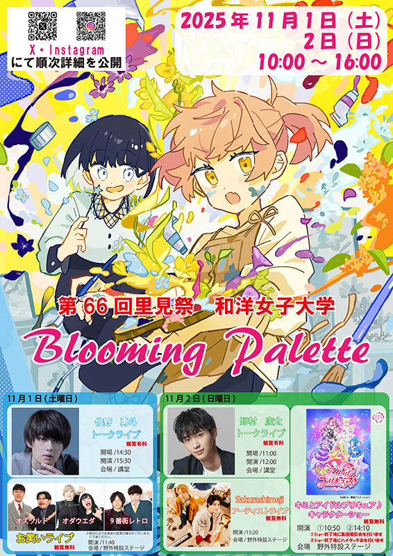 今年のテーマは「Blooming palette」。当日は、ゲストに佐野勇斗さん(1日)と野村康太さん(2日)を招いてのトークショー(有料)や、観覧無料のお笑いライブ(9番街レトロ・オダウエダ・オズワルド)、キャラクターショー(キミとアイドルプリキュア♪ショー)、特設ステージではSakurashimejiやユキノの無料ライブ、サークル発表など、様々なイベントを企画しています。どうぞ、お楽しみに!