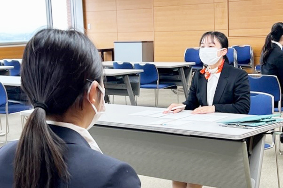 講座内容は、面接マナーや自己PR等を中心に、面接試験に向け、学生一人ひとりが自分なりの面接戦略を立てられるようになることを目標に、様々な内容を学びました。面接練習では、卒業した先輩が、後輩のためにアシスタントティーチャーとして参加。3年生たちは先輩から、面接で印象が良かった点や改善点などについて、アドバイスを受けることができました。